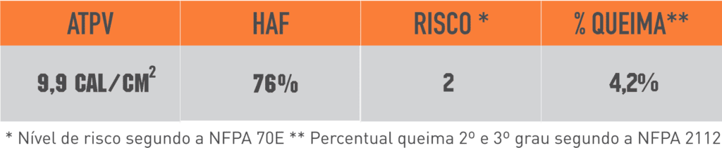 ANTI-CHAMA NR 10 UNISAFE SLIM FR Especificações Técnicas Composição: 88% CO | 12% PA Gramatura: 237,0g/m² | 6,99oz/yd²Simbologia Cores Compartilhar